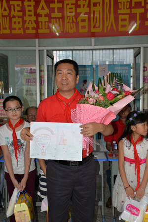 在捐贈(zèng)儀式上,洪江游先生代表康芝紅臉蛋基金向軍屯小學(xué)贈(zèng)送“愛心共建學(xué)?!迸曝遥楹⒆觽儼l(fā)放愛心大禮包。孩子們則向洪董事長獻(xiàn)上了鮮花和自己精心繪畫的美術(shù)作品。