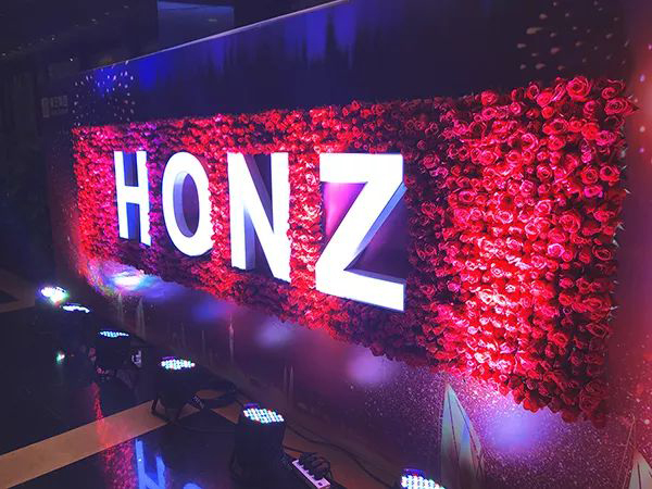 晚會(huì)景墻,鮮花群放,HONZ環(huán)繞其中,喜氣洋溢,歡迎八方來(lái)賓。