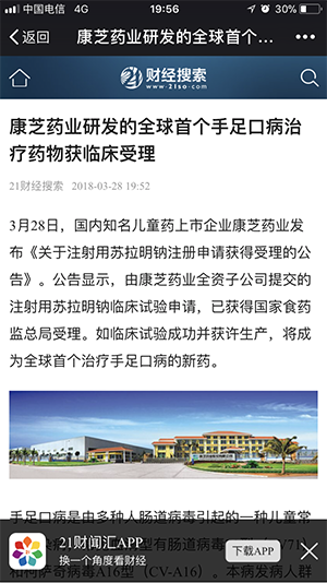 康芝藥業(yè)研發(fā)的蘇拉明鈉治療手足口病新適應(yīng)癥已通過PCT申請國際發(fā)明專利,并先后在中國、日本及新加坡獲得發(fā)明專利授權(quán)。注射用蘇拉明鈉臨床試驗一旦成功,有望成為手足口病的克星,為世界兒童手足口病患者帶來福音。