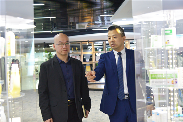 △康芝藥業(yè)副總裁王勇(左)帶領(lǐng)來訪領(lǐng)導(dǎo)參觀