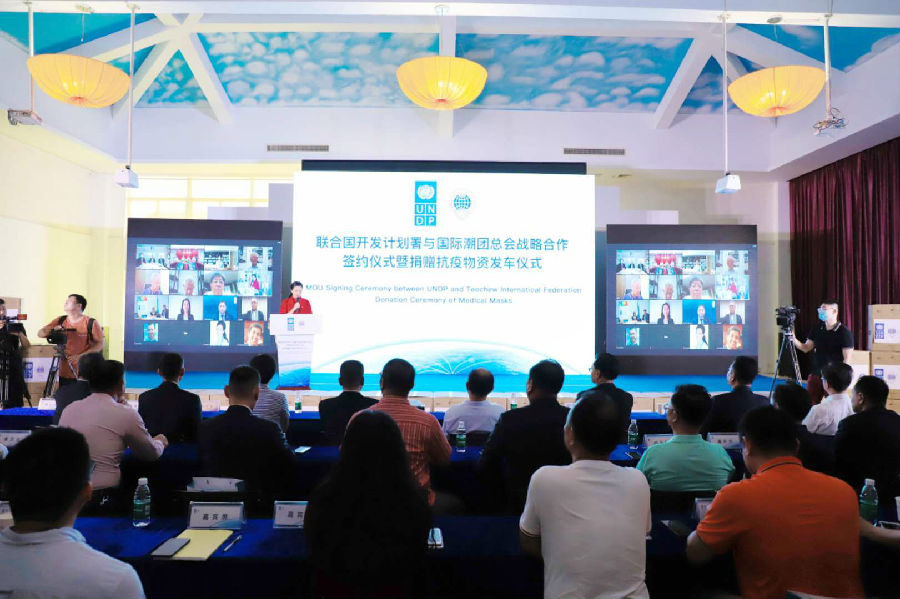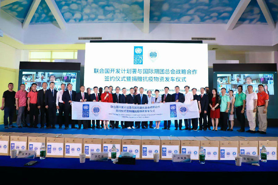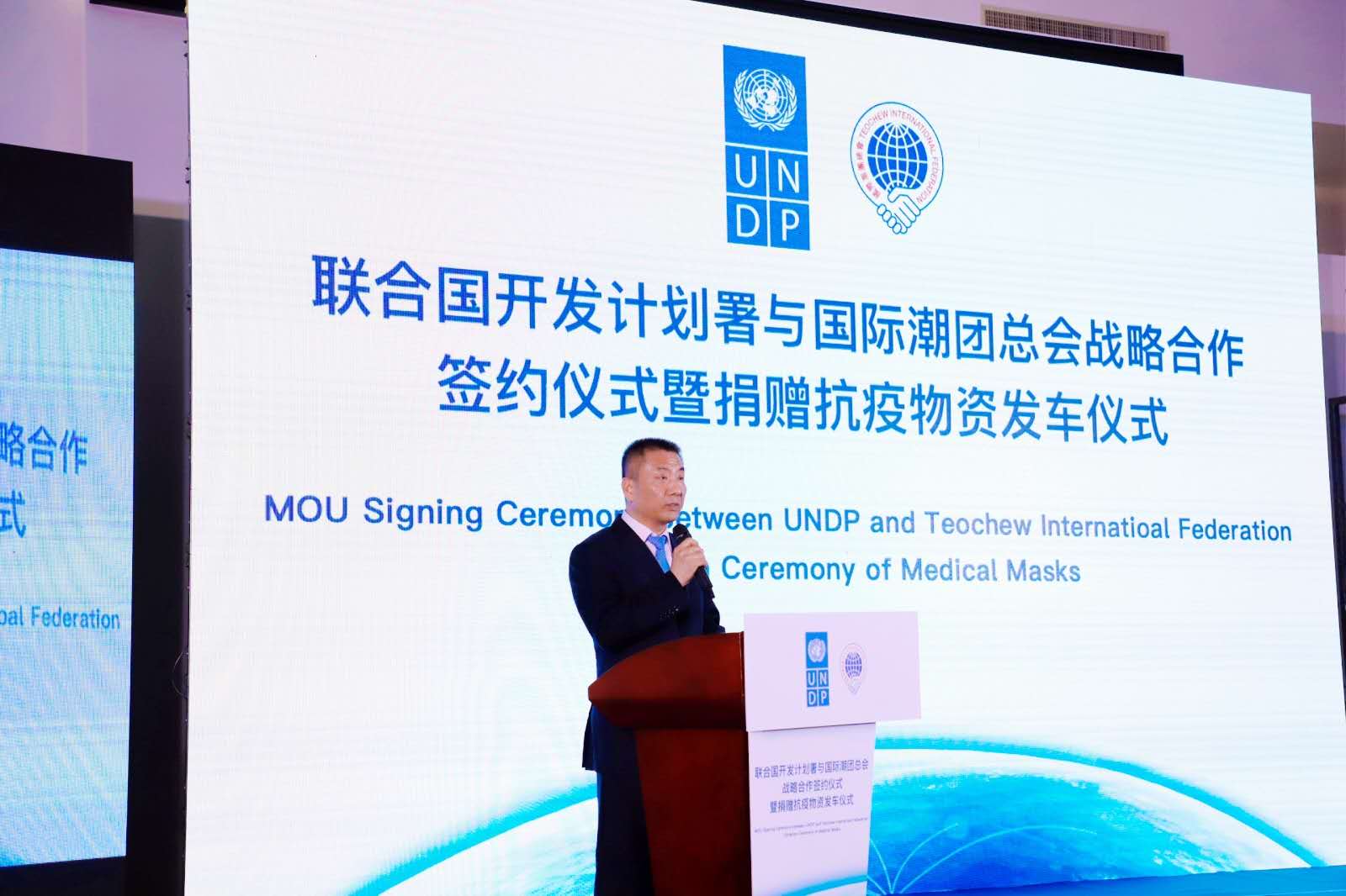 除捐贈抗疫物資發(fā)車儀式外,活動中,國際潮團總會主席洪江游、執(zhí)行主席陳幼南博士代表國際潮團總會簽署了與聯(lián)合國開發(fā)計劃署的合作備忘錄,雙方正式建立戰(zhàn)略合作伙伴關系。