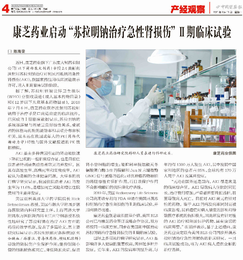 “無論在國外還是在國內(nèi),急性腎損傷都是常見的臨床綜合征。其導(dǎo)致病人住院時(shí)間延長,治療費(fèi)用增加,嚴(yán)重者需要腎臟透析,甚至導(dǎo)致病人死亡。目前對(duì)急性腎損傷尚未有針對(duì)性的藥物。鑒于AKI的高發(fā)病率和容易被臨床忽視,其后遺癥對(duì)病人健康的影響和導(dǎo)致醫(yī)療系統(tǒng)的負(fù)擔(dān)極大,因此研發(fā)針對(duì)性的AKI治療和腎臟保護(hù)藥物,具有迫切的臨床需要?!焙辂惼急硎?,“基于上述理由,康芝藥業(yè)決定自行立項(xiàng),聯(lián)合美國Rediscovery Life Sciences公司,同步開展蘇拉明鈉治療急性腎損傷的臨床研究。而一旦臨床試驗(yàn)成功,將能為AKI病人提供全新的治療選擇。”