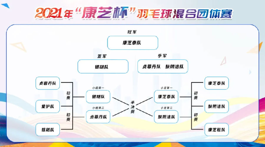 本次比賽共設(shè)混雙1、男雙、混雙2三項比賽,均由小組賽及決賽兩部分組成。每項比賽小組賽均采取隨機抽簽分組的形式兩兩對決,按三局兩勝制逐輪晉級進入決賽;兩個小組的第一和第二交叉淘汰賽,兩支勝隊進入總決賽。經(jīng)過激烈的角逐,比賽圓滿落下帷幕。最終,康芝泰隊奪得冠軍,銀胡隊獲得亞軍,膚陰潔隊、貞蓉丹隊并列獲得第三。