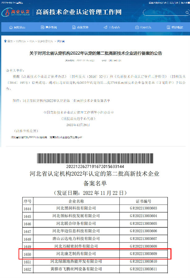 近日,全國高新技術(shù)企業(yè)認(rèn)定管理工作領(lǐng)導(dǎo)小組辦公室批復(fù)了河北省2022年高新技術(shù)企業(yè)認(rèn)定名單,康芝藥業(yè)旗下子公司河北康芝制藥有限公司憑借著專業(yè)實(shí)力及創(chuàng)新能力,成功通過河北省“高新技術(shù)企業(yè)”認(rèn)定。