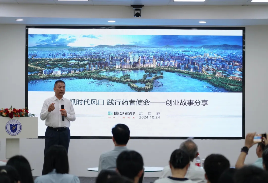 捐贈儀式后,“康芝多媒體廳”迎來首場活動——第十期創(chuàng)新創(chuàng)業(yè)下午茶主題講座。洪江游董事長作為分享嘉賓,以“緊抓時代風口 踐行藥者使命”為主題,圍繞“我的大健康情結(jié)”“三十余載深耕大健康的創(chuàng)業(yè)之路”分享了自己堅定大健康事業(yè)初心、錨定創(chuàng)業(yè)目標、順應(yīng)時代浪潮、抓準機遇積極投身于健康發(fā)展的創(chuàng)業(yè)故事。