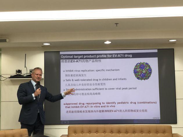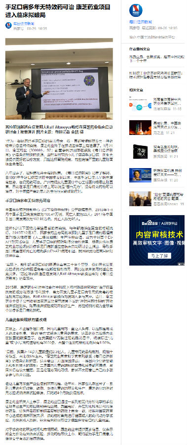 2015年,康芝藥業(yè)引進(jìn)中法合作中科院上海巴斯德研究所的“治療病毒疾病的成分和方法”專利技術(shù),著力研發(fā)兒童手足口病專用抗病毒藥物注射用蘇拉明鈉,Ralf Altmeyer教授作為發(fā)明人參與其中。近日,康芝藥業(yè)全資子公司收到國(guó)家藥品監(jiān)督管理局下發(fā)的“注射用蘇拉明鈉”藥物臨床試驗(yàn)批件。如果臨床試驗(yàn)成功并獲許生產(chǎn),蘇拉明鈉將成為全球首個(gè)治療手足口病的新藥。