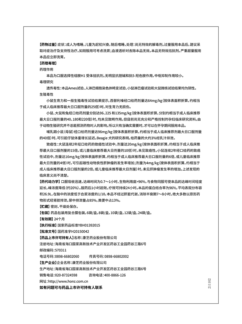 1.2.5mg*8袋; 2.選擇性組胺H1拮抗劑; 3.治療蕁麻疹、過敏性鼻炎、濕疹、皮炎、皮膚瘙癢等癥狀; 4.療效可持續(xù)24小時(shí); 5.顆粒劑,生物利用度>96%。