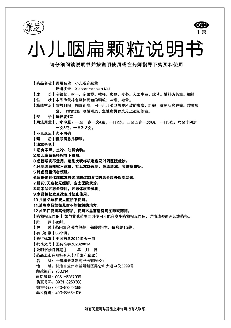 1.4g*15袋; 2.用于小兒肺胃熱盛所致的喉痹、乳蛾,癥見咽喉腫痛、咳嗽痰盛、口舌糜爛;急性咽炎、急性扁桃腺炎見上述證候者。