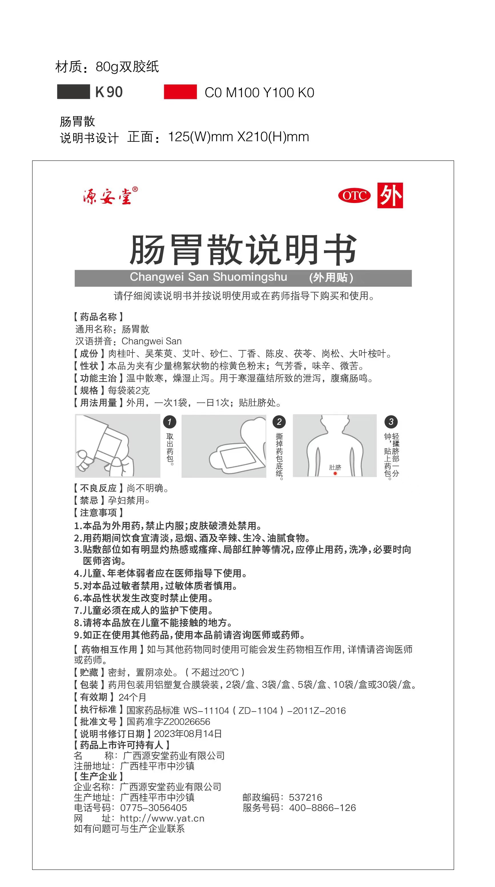 1、30貼; 2、腸胃散研制于1996年源安堂藥業(yè),其方融合壯醫(yī)特色和國醫(yī)之精粹,通過廣西地道藥材肉桂、吳茱萸、砂仁、崗松、大葉桉葉等,結(jié)合現(xiàn)代藥油提取工藝、創(chuàng)新藥粉+藥油混合的給藥方式,常規(guī)應(yīng)用在成人、兒童腹瀉治療、腸系疾病等專業(yè)領(lǐng)域。