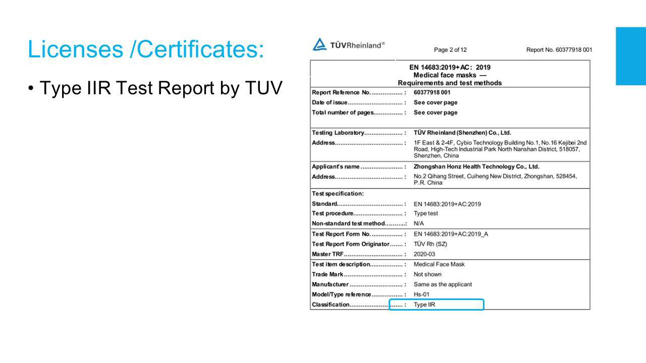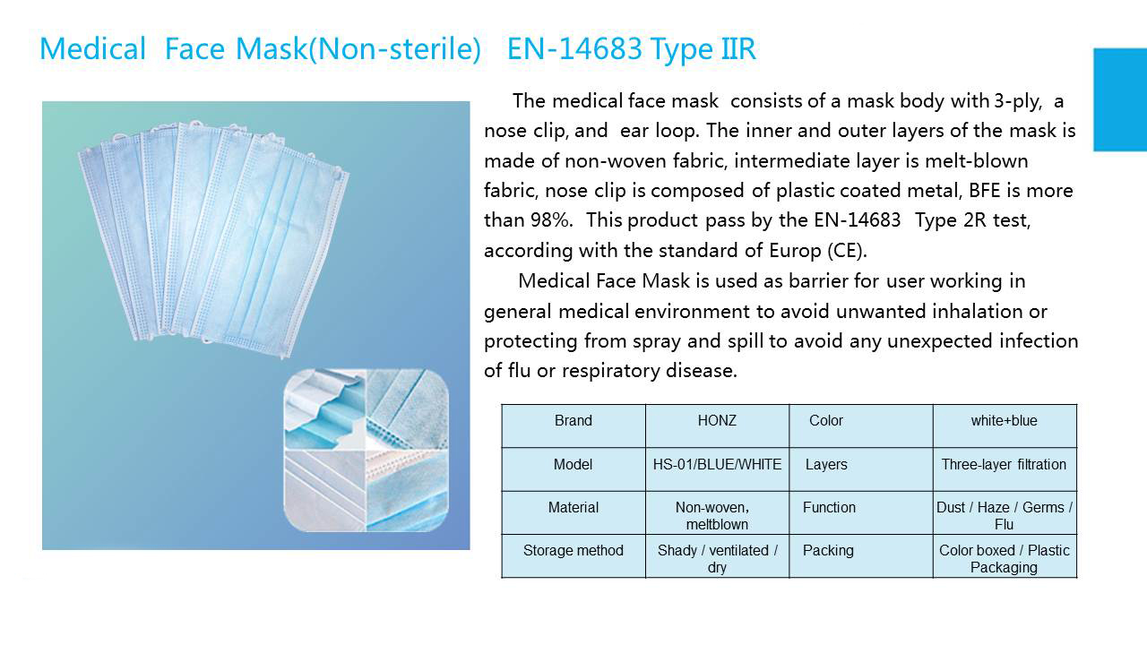 ·EN14683:2019 +AC:2019- Type IIR ·3-ply, Ear Loop ·Composed of Non-woven fabric and Melt-blown fabric
